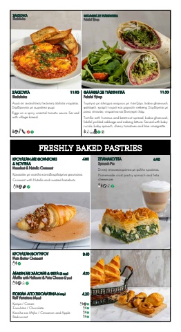 4.80Hazelnut & Nutella Croissant%u039a%u03a1%u039f%u03a5%u0391%u03a3%u0391%u039d %u039c%u0395 %u03a6%u039f%u03a5%u039d%u03a4%u039f%u03a5%u039a%u0399& %u039d%u039f%u03a5%u03a4%u0395%u039b%u0391%u039a%u03c1%u03bf%u03c5%u03b1%u03c3%u03ac%u03bd %u03bc%u03b5 %u03bd%u03bf%u03c5%u03c4%u03ad%u03bb%u03b1 %u03ba%u03b1%u03b9 %u03ba%u03b1%u03b2%u03bf%u03c5%u03c1%u03b4%u03b9%u03c3%u03bc%u03ad%u03bd%u03b1 %u03c6%u03bf%u03c5%u03bd%u03c4%u03bf%u03cd%u03ba%u03b9%u03b1.Croissant with Nutella and roasted hazelnuts.Spinach Pie%u03a3%u03a0%u0391%u039d%u0391%u039a%u039f%u03a0%u0399%u03a4%u0391%u03a3%u03c0%u03b9%u03c4%u03b9%u03ba%u03ae %u03c3%u03c0%u03b1%u03bd%u03b1%u03ba%u03bf%u03c4%u03c5%u03c1%u03cc%u03c0%u03b9%u03c4%u03b1 %u03bc%u03b5 %u03c6%u03cd%u03bb%u03bb%u03bf %u03ba%u03c1%u03bf%u03cd%u03c3%u03c4%u03b1%u03c2.Homemade crust pastry spinach and feta cheese pie.%u039a%u03a1%u039f%u03a5%u0391%u03a3%u0391%u039d %u0392%u039f%u03a5%u03a4Y%u03a1%u039f%u03a5 Plain Butter Croissant3.40%u039a%u03c1%u03ad%u03bc%u03b1 / Cream%u03a3%u03bf%u03ba%u03bf%u03bb%u03ac%u03c4%u03b1 / Chocolate %u039a%u03b1%u03bd%u03ad%u03bb%u03b1 %u03ba%u03b1%u03b9 %u039c%u03ae%u03bb%u03bf / Cinnamon and AppleRedcurrant4.20Roll Variations (4 pcs)%u03a0%u039f%u0399%u039a%u0399%u039b%u0399%u0391 %u0391%u03a0%u039f %u03a3%u03a6%u039f%u039b%u0399%u0391%u03a4%u0399%u039d%u0399%u0391 (4 %u03ba%u03bf%u03bc.)4.50Muffin with Halloumi & Feta Cheese (2 pcs)%u039c%u0391%u03a6%u0399%u039d %u039c%u0395 %u03a7%u0391%u039b%u039f%u03a5%u039c%u0399 & %u03a6%u0395%u03a4%u0391 (2 %u03ba%u03bf%u03bc.)6.9011.50Falafel Wrap%u03a6%u0391%u039b%u0391%u03a6%u0395%u039b %u03a3%u0395 %u03a4%u03a5%u039b%u0399%u03a7%u03a4%u0397 %u03a0%u0399%u03a4%u0391 %u03a4%u03bf%u03c1%u03c4%u03af%u03b3%u03b9%u03b1 %u03bc%u03b5 %u03ac%u03bb%u03b5%u03b9%u03bc%u03bc%u03b1 %u03c7%u03bf%u03cd%u03bc%u03bf%u03c5%u03c2 %u03bc%u03b5 %u03c0%u03b1%u03bd%u03c4%u03b6%u03ac%u03c1%u03b9, baba ghanoush, %u03c6%u03b1%u03bb%u03ac%u03c6%u03b5%u03bb, %u03ba%u03c1%u03b1%u03bc%u03c0%u03af %u03c4%u03bf%u03c5%u03c1%u03c3%u03af %u03ba%u03b1%u03b9 %u03bc%u03b1%u03c1%u03bf%u03cd%u03bb%u03b9 iceberg. %u03a3%u03b5%u03c1%u03b2%u03af%u03c1%u03b5%u03c4%u03b1%u03b9 %u03bc%u03b5 %u03c1%u03cc%u03ba%u03b1, %u03c3%u03c0%u03b1%u03bd%u03ac%u03ba%u03b9, %u03bd%u03c4%u03bf%u03bc%u03b1%u03c4%u03af%u03bd%u03b9%u03b1 %u03ba%u03b1%u03b9 %u03b2%u03b9%u03bd%u03b5%u03b3%u03ba%u03c1%u03ad%u03c4 %u03bb%u03ac%u03b9%u03bc.Tortilla with hummus and beetroot spread, baba ghanoush, falafel, pickled cabbage and iceberg lettuce. Served with baby rucola, baby spinach, cherry tomatoes and lime vinaigrette.Falafel Wrap%u03a6%u0391%u039b%u0391%u03a6%u0395%u039b %u03a3%u0395 %u03a4%u03a5%u039b%u0399%u03a7%u03a4%u0397 %u03a0%u0399%u03a4%u0391 Shakshuka%u03a3%u0391%u039a%u03a3%u039f%u03a5%u039a%u039111.90Shakshuka%u03a3%u0391%u039a%u03a3%u039f%u03a5%u039a%u0391%u0391%u03c5%u03b3%u03ac %u03c3%u03b5 %u03b1%u03bd%u03b1%u03c4%u03bf%u03bb%u03af%u03c4%u03b9%u03ba%u03b7 %u03c0%u03b9%u03ba%u03ac%u03bd%u03c4%u03b9%u03ba%u03b7 %u03c3%u03ac%u03bb%u03c4%u03c3%u03b1 %u03bd%u03c4%u03bf%u03bc%u03ac%u03c4%u03b1%u03c2. %u03a3%u03b5%u03c1%u03b2%u03af%u03c1%u03bf%u03bd%u03c4%u03b1%u03b9 %u03bc%u03b5 %u03c7%u03c9%u03c1%u03b9%u03ac%u03c4%u03b9%u03ba%u03bf %u03c8%u03c9%u03bc%u03af.Eggs on a spicy oriental tomato sauce. Served with village bread.FRESHLY BAKED PASTRIES