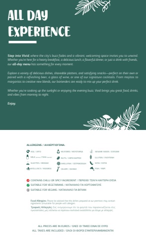 ALL DAY EXPERIENCEStep into Vivid, where the city's buzz fades and a vibrant, welcoming space invites you to unwind. Whether you're here for a hearty breakfast, a delicious lunch, a flavorful dinner, or just a drink with friends, our all-day menu has something for every moment.Explore a variety of delicious dishes, shareable platters, and satisfying snacks%u2014perfect on their own or paired with a refreshing beer, a glass of wine, or one of our signature cocktails. From mojitos to margaritas to creative new blends, our bartenders are ready to mix up your perfect drink.Whether you're soaking up the sunlight or enjoying the evening buzz, Vivid brings you great food, drinks, and vibes from morning to night.Enjoy.%u03a4%u03c1%u03bf%u03c6%u03b9%u03ba%u03ad%u03c2 %u0391%u03bb%u03bb%u03b5%u03c1%u03b3%u03af%u03b5%u03c2:%u03a3%u03b1%u03c2 %u03b5%u03bd%u03b7%u00b5%u03b5%u03c1%u03ce%u03bd%u03bf%u03c5%u00b5%u03b5 %u03cc%u03c4%u03b9 %u03c4%u03b1 %u03c6%u03b1%u03b3%u03b7%u03c4%u03ac %u03c0%u03bf%u03c5 %u03c0%u03b1%u03c1%u03b1%u03c3%u03ba%u03b5%u03c5%u03ac%u03b6%u03bf%u03bd%u03c4%u03b1%u03b9 %u03c3%u03c4%u03b9%u03c2 %u03b5%u03b3%u03ba%u03b1%u03c4%u03b1%u03c3%u03c4%u03ac%u03c3%u03b5%u03b9%u03c2 %u00b5%u03b1%u03c2 %u03b5%u03bd%u03b4%u03ad%u03c7%u03b5%u03c4%u03b1%u03b9 %u03bd%u03b1 %u03c0%u03b5%u03c1%u03b9%u03ad%u03c7%u03bf%u03c5%u03bd %u03c3%u03c5%u03c3%u03c4%u03b1%u03c4%u03b9%u03ba%u03ac %u03b1%u03ba%u03b1%u03c4%u03ac%u03bb%u03bb%u03b7%u03bb%u03b1 %u03b3%u03b9%u03b1 %u03ac%u03c4%u03bf%u00b5%u03b1 %u00b5%u03b5 %u03b1%u03bb%u03bb%u03b5%u03c1%u03b3%u03af%u03b5%u03c2.SUITABLE FOR VEGETARIANS / %u039a%u0391%u03a4%u0391%u039b%u039b%u0397%u039b%u039f %u0393%u0399%u0391 %u03a7%u039f%u03a1%u03a4%u039f%u03a6%u0391%u0393%u039f%u03a5%u03a3SUITABLE FOR VEGANS / %u039a%u0391%u03a4%u0391%u039b%u039b%u0397%u039b%u039f %u0393%u0399%u0391 %u0392%u0399%u0393%u039a%u0391%u039d Food Allergies:Please be advised that the dishes prepared at our premises may containingredients unsuitable for people with allergies.ALL TAXES ARE INCLUDED / O%u039b%u039f%u0399 %u039f%u0399 %u03a6%u039f%u03a1%u039f%u0399 %u03a3%u03a5%u039c%u03a0%u0395%u03a1%u0399%u039b%u0391%u039c%u0392%u0391%u039d%u039f%u039d%u03a4%u0391%u0399 ALL PRICES ARE IN EUROS / %u039f%u039b%u0395%u03a3 %u039f%u0399 %u03a4%u0399%u039c%u0395%u03a3 %u0395%u0399%u039d%u0391%u0399 %u03a3%u0395 %u0395%u03a5%u03a1%u03a9 CONTAINS CHILLI OR SPICY INGREDIENT / %u03a0%u0395%u03a1%u0399%u0395%u03a7%u0395%u0399 %u03a4%u03a3%u0399%u039b%u0399 %u0389 %u039a%u0391%u03a5%u03a4%u0395%u03a1%u0397 %u039f%u03a5%u03a3%u0399%u0391 ALLERGENS / %u0391%u039b%u039b%u0395%u03a1%u0393%u0399%u039f%u0393%u039f%u039d%u0391:MOLLUSCS / %u039c%u0391%u039b%u0391%u039a%u0399%u0391SHELLFISH / %u039f%u03a3%u03a4%u03a1%u0391%u039a%u039f%u0395%u0399%u0394%u0397CELERY / %u03a3%u0395%u039b%u0399%u039d%u039f EGG / %u0391%u03a5%u0393%u039f FISH / %u03a8%u0391%u03a1%u0399MILK(lactose) /%u0393%u0391%u039b%u0391(%u03bb%u03b1%u03ba%u03c4%u03cc%u03b6%u03b7) NUTS / %u039e%u0397%u03a1%u039f%u0399 %u039a%u0391%u03a1%u03a0%u039f%u0399 GLUTEN / %u0393%u039b%u039f%u03a5%u03a4%u0395%u039d%u0397 SESAME SEEDS / %u03a3%u039f%u03a5%u03a3%u0391%u039c%u0399SULFITES / %u0398%u0395%u0399%u03a9%u0394%u0397MUSTARD / %u039c%u039f%u03a5%u03a3%u03a4%u0391%u03a1%u0394%u0391SOYA / %u03a3%u039f%u0393%u0399%u0391