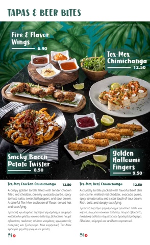A crispy golden tortilla filled with tender chicken fillet, red cheddar, creamy avocado pur%u00e9e, spicytomato salsa, sweet bell peppers, and sour cream. A colorful Tex-Mex explosion of flavor, served hot and satisfying.%u03a4%u03c1%u03b1%u03b3%u03b1%u03bd%u03ae %u03c7%u03c1%u03c5%u03c3%u03b1%u03c6%u03ad%u03bd%u03b9%u03b1 %u03c4%u03bf%u03c1%u03c4%u03af%u03b3%u03b9%u03b1 %u03b3%u03b5%u03bc%u03b9%u03c3%u03bc%u03ad%u03bd%u03b7 %u03bc%u03b5 %u03b6%u03bf%u03c5%u03bc%u03b5%u03c1%u03cc%u03ba%u03bf%u03c4%u03cc%u03c0%u03bf%u03c5%u03bb%u03bf %u03c6%u03b9%u03bb%u03ad%u03c4%u03bf, %u03ba%u03cc%u03ba%u03ba%u03b9%u03bd%u03bf %u03c4%u03c3%u03ad%u03bd%u03c4%u03b1%u03c1, %u03b2%u03b5%u03bb%u03bf%u03cd%u03b4%u03b9%u03bd%u03bf %u03c0%u03bf%u03c5%u03c1%u03ad%u03b1%u03b2%u03bf%u03ba%u03ac%u03bd%u03c4%u03bf, %u03c0%u03b9%u03ba%u03ac%u03bd%u03c4%u03b9%u03ba%u03b7 %u03c3%u03ac%u03bb%u03c4%u03c3%u03b1 %u03bd%u03c4%u03bf%u03bc%u03ac%u03c4%u03b1%u03c2, %u03c7%u03c1%u03c9%u03bc%u03b1%u03c4%u03b9%u03c3%u03c4%u03ad%u03c2 %u03c0%u03b9%u03c0%u03b5%u03c1%u03b9%u03ad%u03c2 %u03ba%u03b1%u03b9 %u03be%u03b9%u03bd%u03cc%u03ba%u03c1%u03b5%u03bc%u03b1. %u039c%u03b9%u03b1 %u03b5%u03ba%u03c1%u03b7%u03ba%u03c4%u03b9%u03ba%u03ae Tex-Mex %u03b5%u03bc%u03c0%u03b5%u03b9%u03c1%u03af%u03b1 %u03b3%u03b5%u03bc%u03ac%u03c4%u03b7 %u03c7%u03c1%u03ce%u03bc%u03b1 %u03ba%u03b1%u03b9 %u03b3%u03b5%u03cd%u03c3%u03b7.Tex-Mex Chicken Chimichanga12.50TAPAS & BEER BITESA crunchy tortilla packed with flavorful beef chili con carne, melted red cheddar, avocado pur%u00e9e, spicy tomato salsa, and a cool touch of sour cream. Rich, bold, and deeply satisfying.%u03a4%u03c1%u03b1%u03b3%u03b1%u03bd%u03ae %u03c4%u03bf%u03c1%u03c4%u03af%u03b3%u03b9%u03b1 %u03b3%u03b5%u03bc%u03b9%u03c3%u03bc%u03ad%u03bd%u03b7 %u03bc%u03b5 %u03b3%u03b5%u03c5%u03c3%u03c4%u03b9%u03ba%u03cc %u03c4%u03c3%u03af%u03bb%u03b9 %u03ba%u03bf%u03bd %u03ba%u03ac%u03c1%u03bd%u03b5, %u03bb%u03b9%u03c9%u03bc%u03ad%u03bd%u03bf %u03ba%u03cc%u03ba%u03ba%u03b9%u03bd%u03bf %u03c4%u03c3%u03ad%u03bd%u03c4%u03b1%u03c1, %u03c0%u03bf%u03c5%u03c1%u03ad %u03b1%u03b2%u03bf%u03ba%u03ac%u03bd%u03c4%u03bf, %u03c0%u03b9%u03ba%u03ac%u03bd%u03c4%u03b9%u03ba%u03b7 %u03c3%u03ac%u03bb%u03c4%u03c3%u03b1 %u03bd%u03c4%u03bf%u03bc%u03ac%u03c4%u03b1%u03c2 %u03ba%u03b1%u03b9 %u03b4%u03c1%u03bf%u03c3%u03b5%u03c1%u03ae %u03be%u03b9%u03bd%u03cc%u03ba%u03c1%u03b5%u03bc%u03b1. %u03a0%u03bb%u03bf%u03cd%u03c3%u03b9%u03bf, %u03c4%u03bf%u03bb%u03bc%u03b7%u03c1%u03cc %u03ba%u03b1%u03b9 %u03b1%u03c0%u03cc%u03bb%u03c5%u03c4%u03b1 %u03c7%u03bf%u03c1%u03c4%u03b1%u03c3%u03c4%u03b9%u03ba%u03cc.Tex-Mex Beef Chimichanga12.50Fire & Flavor Wings6.90Tex-MexChimichanga12.50Smoky BaconPotato Twister8.50Golden HalloumiFingers9.50%u03bf%u03b9 %u03c6%u03c9%u03c4%u03bf%u03b3%u03c1%u03b1%u03c6%u03af%u03b5%u03c2 %u03b5%u03af%u03bd%u03b1%u03b9 %u03b5%u03bd%u03b4%u03b5%u03b9%u03ba%u03c4%u03b9%u03ba%u03ad%u03c2 / images shown are indicative