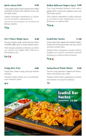 Garlic Cheese MeltCrispy, golden garlic bread, layered with melted mozzarella, finished with aromatic chives and rich garlic butter. %u03a4%u03c1%u03b1%u03b3%u03b1%u03bd%u03cc, %u03c7%u03c1%u03c5%u03c3%u03b1%u03c6%u03ad%u03bd%u03b9%u03bf %u03c3%u03ba%u03bf%u03c1%u03b4%u03cc%u03c8%u03c9%u03bc%u03bf, %u03bc%u03b5 %u03bb%u03b9%u03c9%u03bc%u03ad%u03bd%u03bf %u03c4%u03c5%u03c1%u03af %u03ba%u03b1%u03b9 %u03bc%u03bf%u03c4%u03c3%u03b1%u03c1%u03ad%u03bb%u03b1, %u03b3%u03b1%u03c1%u03bd%u03b9%u03c1%u03b9%u03c3%u03bc%u03ad%u03bd%u03bf %u03bc%u03b5 %u03b1%u03c1%u03c9%u03bc%u03b1%u03c4%u03b9%u03ba%u03cc %u03c3%u03c7%u03bf%u03b9%u03bd%u03cc%u03c0%u03c1%u03b1%u03c3%u03bf %u03ba%u03b1%u03b9 %u03b1%u03c0%u03bf%u03bb%u03b1%u03c5%u03c3%u03c4%u03b9%u03ba%u03cc %u03b2%u03bf%u03cd%u03c4%u03c5%u03c1%u03bf %u03c3%u03ba%u03cc%u03c1%u03b4%u03bf%u03c5.5.50Crispy Beer Fries4.00Golden Halloumi Fingers (5pcs)Five crispy breaded halloumi sticks with a golden finish, served with raspberry sauce and fresh baby ruccola. %u03a0%u03ad%u03bd%u03c4%u03b5 %u03c4%u03c1%u03b1%u03b3%u03b1%u03bd%u03ad%u03c2 %u03c0%u03b1%u03bd%u03b1%u03c1%u03b9%u03c3%u03bc%u03ad%u03bd%u03b5%u03c2 %u03bb%u03c9%u03c1%u03af%u03b4%u03b5%u03c2 %u03c7%u03b1%u03bb%u03bf%u03c5%u03bc%u03b9%u03bf%u03cd %u03bc%u03b5 %u03c7%u03c1%u03c5%u03c3%u03b1%u03c6%u03ad%u03bd%u03b9%u03b1 %u03cc%u03c8%u03b7, %u03c3%u03b5%u03c1%u03b2%u03b9%u03c1%u03b9%u03c3%u03bc%u03ad%u03bd%u03b5%u03c2 %u03bc%u03b5 %u03c3%u03c9%u03c2 %u03b2%u03b1%u03c4%u03cc%u03bc%u03bf%u03c5%u03c1%u03bf%u03c5 %u03ba%u03b1%u03b9 %u03c6%u03c1%u03ad%u03c3%u03ba%u03b9%u03b1 %u03c1%u03cc%u03ba%u03b1.9.50Smoky Bacon Potato TwisterTwister crispy potatoes, topped with bacon, chives, and creamy sour cream.%u03a4%u03c1%u03b1%u03b3%u03b1%u03bd%u03ad%u03c2 %u03c0%u03b1%u03c4%u03ac%u03c4%u03b5%u03c2 twister, %u03b3%u03b1%u03c1%u03bd%u03b9%u03c1%u03b9%u03c3%u03bc%u03ad%u03bd%u03b5%u03c2 %u03bc%u03b5 %u03bc%u03c0%u03ad%u03b9%u03ba%u03bf%u03bd, %u03c3%u03c7%u03bf%u03b9%u03bd%u03cc%u03c0%u03c1%u03b1%u03c3%u03bf %u03ba%u03b1%u03b9 %u03ba%u03c1%u03b5%u03bc%u03ce%u03b4%u03b7 %u03be%u03b9%u03bd%u03cc%u03ba%u03c1%u03b5%u03bc%u03b1.8.50Fire & Flavor Wings (5pcs) 6.90Five juicy chicken wings, served with your choice of Buffalo, BBQ, Spicy, or Honey Mustard sauce.%u03a0%u03ad%u03bd%u03c4%u03b5 %u03b6%u03bf%u03c5%u03bc%u03b5%u03c1%u03ad%u03c2 %u03c6%u03c4%u03b5%u03c1%u03bf%u03cd%u03b3%u03b5%u03c2 %u03ba%u03bf%u03c4%u03cc%u03c0%u03bf%u03c5%u03bb%u03bf%u03c5, %u03bc%u03b5 %u03c3%u03ac%u03bb%u03c4%u03c3%u03b1%u03c4%u03b7%u03c2 %u03b5%u03c0%u03b9%u03bb%u03bf%u03b3%u03ae%u03c2 %u03c3%u03b1%u03c2: Buffalo, BBQ, %u03a0%u03b9%u03ba%u03ac%u03bd%u03c4%u03b9%u03ba%u03b7 %u03ae %u039c%u03bf%u03c5%u03c3%u03c4%u03ac%u03c1%u03b4%u03b1 %u03bc%u03b5 %u03bc%u03ad%u03bb%u03b9.Loaded Bar Nachos11.50Crispy nacho chips topped with melted Cheddar. Served with fresh guacamole, cool sour cream and spicy tomato salsa.%u03a4%u03c1%u03b1%u03b3%u03b1%u03bd%u03ac %u03bd%u03ac%u03c4%u03c3%u03bf%u03c2, %u03ba%u03b1%u03bb%u03c5%u03bc%u03bc%u03ad%u03bd%u03b1 %u03bc%u03b5 %u03bb%u03b9%u03c9%u03bc%u03ad%u03bd%u03bf %u03c4%u03c3%u03ad%u03bd%u03c4%u03b1%u03c1. %u03a3%u03b5%u03c1%u03b2%u03af%u03c1%u03bf%u03bd%u03c4%u03b1%u03b9 %u03bc%u03b5 %u03c6%u03c1%u03ad%u03c3%u03ba%u03bf %u03b3%u03bf%u03c5%u03b1%u03ba%u03b1%u03bc%u03cc%u03bb%u03b5, %u03b4%u03c1%u03bf%u03c3%u03b5%u03c1%u03ae %u03be%u03b9%u03bd%u03cc%u03ba%u03c1%u03b5%u03bc%u03b1 %u03ba%u03b1%u03b9 %u03c0%u03b9%u03ba%u03ac%u03bd%u03c4%u03b9%u03ba%u03b7 %u03c3%u03ac%u03bb%u03c4%u03c3%u03b1 %u03bd%u03c4%u03bf%u03bc%u03ac%u03c4%u03b1%u03c2.French fries, made to enjoy with your favorite cold beer.%u03a4%u03b7%u03b3%u03b1%u03bd%u03b7%u03c4%u03ad%u03c2 %u03c0%u03b1%u03c4%u03ac%u03c4%u03b5%u03c2, %u03b9%u03b4%u03b1%u03bd%u03b9%u03ba%u03ad%u03c2 %u03b3%u03b9%u03b1 %u03bd%u03b1 %u03c4%u03b9%u03c2 %u03b1%u03c0%u03bf%u03bb%u03b1%u03cd%u03c3%u03b5%u03c4%u03b5 %u03bc%u03b5 %u03bc%u03b9%u03b1 %u03c0%u03b1%u03b3%u03c9%u03bc%u03ad%u03bd%u03b7 %u03bc%u03c0%u03cd%u03c1%u03b1.Loaded BarNachos11.50%u03bf%u03b9 %u03c6%u03c9%u03c4%u03bf%u03b3%u03c1%u03b1%u03c6%u03af%u03b5%u03c2 %u03b5%u03af%u03bd%u03b1%u03b9 %u03b5%u03bd%u03b4%u03b5%u03b9%u03ba%u03c4%u03b9%u03ba%u03ad%u03c2 / images shown are indicative
