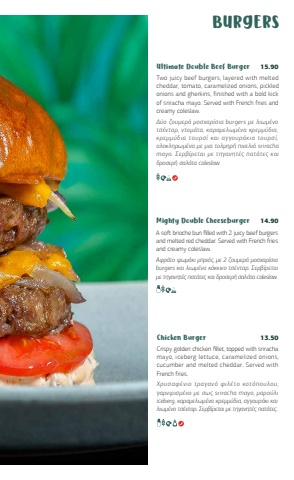 BURGERS Ultimate Double Beef Burger15.90Two juicy beef burgers, layered with melted cheddar, tomato, caramelized onions, pickled onions and gherkins, finished with a bold kick of sriracha mayo. Served with French friesand creamy coleslaw.%u0394%u03cd%u03bf %u03b6%u03bf%u03c5%u03bc%u03b5%u03c1%u03ac %u03bc%u03bf%u03c3%u03c7%u03b1%u03c1%u03af%u03c3%u03b9%u03b1 burgers %u03bc%u03b5 %u03bb%u03b9%u03c9%u03bc%u03ad%u03bd%u03bf %u03c4%u03c3%u03ad%u03bd%u03c4%u03b1%u03c1, %u03bd%u03c4%u03bf%u03bc%u03ac%u03c4%u03b1, %u03ba%u03b1%u03c1%u03b1%u03bc%u03b5%u03bb%u03c9%u03bc%u03ad%u03bd%u03b1 %u03ba%u03c1%u03b5%u03bc%u03bc%u03cd%u03b4%u03b9%u03b1, %u03ba%u03c1%u03b5%u03bc%u03bc%u03cd%u03b4%u03b9%u03b1 %u03c4%u03bf%u03c5%u03c1%u03c3%u03af %u03ba%u03b1%u03b9 %u03b1%u03b3%u03b3%u03bf%u03c5%u03c1%u03ac%u03ba%u03b9%u03b1 %u03c4%u03bf%u03c5%u03c1%u03c3%u03af, %u03bf%u03bb%u03bf%u03ba%u03bb%u03b7%u03c1%u03c9%u03bc%u03ad%u03bd%u03b1 %u03bc%u03b5 %u03bc%u03b9%u03b1 %u03c4%u03bf%u03bb%u03bc%u03b7%u03c1%u03ae %u03c0%u03b9%u03bd%u03b5%u03bb%u03b9%u03ac sriracha mayo. %u03a3%u03b5%u03c1%u03b2%u03af%u03c1%u03b5%u03c4%u03b1%u03b9 %u03bc%u03b5 %u03c4%u03b7%u03b3%u03b1%u03bd%u03b7%u03c4%u03ad%u03c2 %u03c0%u03b1%u03c4%u03ac%u03c4%u03b5%u03c2 %u03ba%u03b1%u03b9 %u03b4%u03c1%u03bf%u03c3%u03b5%u03c1%u03ae %u03c3%u03b1%u03bb%u03ac%u03c4%u03b1 coleslaw.Mighty Double Cheeseburger14.90A soft brioche bun filled with 2 juicy beef burgers and melted red cheddar. Served with French fries and creamy coleslaw.%u0391%u03c6%u03c1%u03ac%u03c4%u03bf %u03c8%u03c9%u03bc%u03ac%u03ba%u03b9 %u03bc%u03c0%u03c1%u03b9%u03cc%u03c2, %u03bc%u03b5 2 %u03b6%u03bf%u03c5%u03bc%u03b5%u03c1%u03ac %u03bc%u03bf%u03c3%u03c7%u03b1%u03c1%u03af%u03c3%u03b9%u03b1 burgers %u03ba%u03b1%u03b9 %u03bb%u03b9%u03c9%u03bc%u03ad%u03bd%u03bf %u03ba%u03cc%u03ba%u03ba%u03b9%u03bd%u03bf %u03c4%u03c3%u03ad%u03bd%u03c4%u03b1%u03c1. %u03a3%u03b5%u03c1%u03b2%u03af%u03c1%u03b5%u03c4%u03b1%u03b9 %u03bc%u03b5 %u03c4%u03b7%u03b3%u03b1%u03bd%u03b7%u03c4%u03ad%u03c2 %u03c0%u03b1%u03c4%u03ac%u03c4%u03b5%u03c2 %u03ba%u03b1%u03b9 %u03b4%u03c1%u03bf%u03c3%u03b5%u03c1%u03ae %u03c3%u03b1%u03bb%u03ac%u03c4%u03b1 coleslaw.Chicken Burger13.50Crispy golden chicken fillet, topped with srirachamayo, iceberg lettuce, caramelized onions, cucumber and melted cheddar. Served with French fries.%u03a7%u03c1%u03c5%u03c3%u03b1%u03c6%u03ad%u03bd%u03b9%u03bf %u03c4%u03c1%u03b1%u03b3%u03b1%u03bd%u03cc %u03c6%u03b9%u03bb%u03ad%u03c4%u03bf %u03ba%u03bf%u03c4%u03cc%u03c0%u03bf%u03c5%u03bb%u03bf%u03c5, %u03b3%u03b1%u03c1%u03bd%u03b9%u03c1%u03b9%u03c3%u03bc%u03ad%u03bd%u03bf %u03bc%u03b5 %u03c3%u03c9%u03c2 sriracha mayo, %u03bc%u03b1%u03c1%u03bf%u03cd%u03bb%u03b9 iceberg, %u03ba%u03b1%u03c1%u03b1%u03bc%u03b5%u03bb%u03c9%u03bc%u03ad%u03bd%u03b1 %u03ba%u03c1%u03b5%u03bc%u03bc%u03cd%u03b4%u03b9%u03b1, %u03b1%u03b3%u03b3%u03bf%u03c5%u03c1%u03ac%u03ba%u03b9 %u03ba%u03b1%u03b9 %u03bb%u03b9%u03c9%u03bc%u03ad%u03bd%u03bf %u03c4%u03c3%u03ad%u03bd%u03c4%u03b1%u03c1. %u03a3%u03b5%u03c1%u03b2%u03af%u03c1%u03b5%u03c4%u03b1%u03b9 %u03bc%u03b5 %u03c4%u03b7%u03b3%u03b1%u03bd%u03b7%u03c4%u03ad%u03c2 %u03c0%u03b1%u03c4%u03ac%u03c4%u03b5%u03c2.